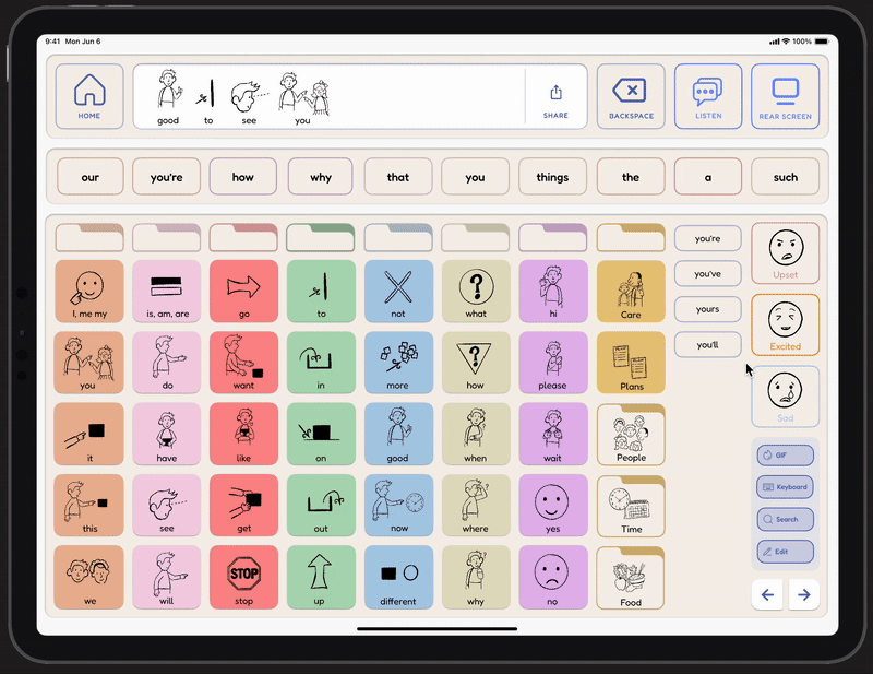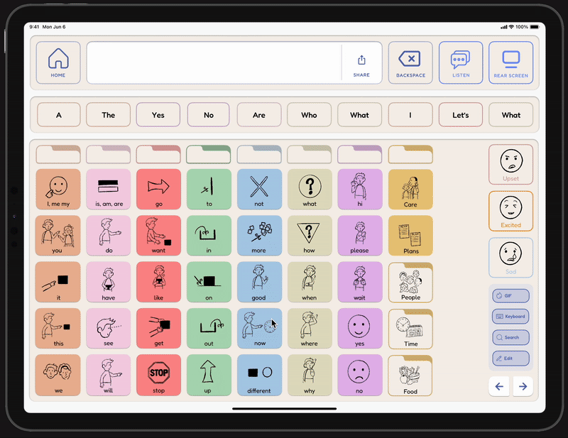 We refined spacing, contrast, and touch-target sizes for accessibility and adjusted the symbol set for clarity. We used line-style illustrations—a familiar convention from Proloquo—to reduce visual clutter and speed up recognition.